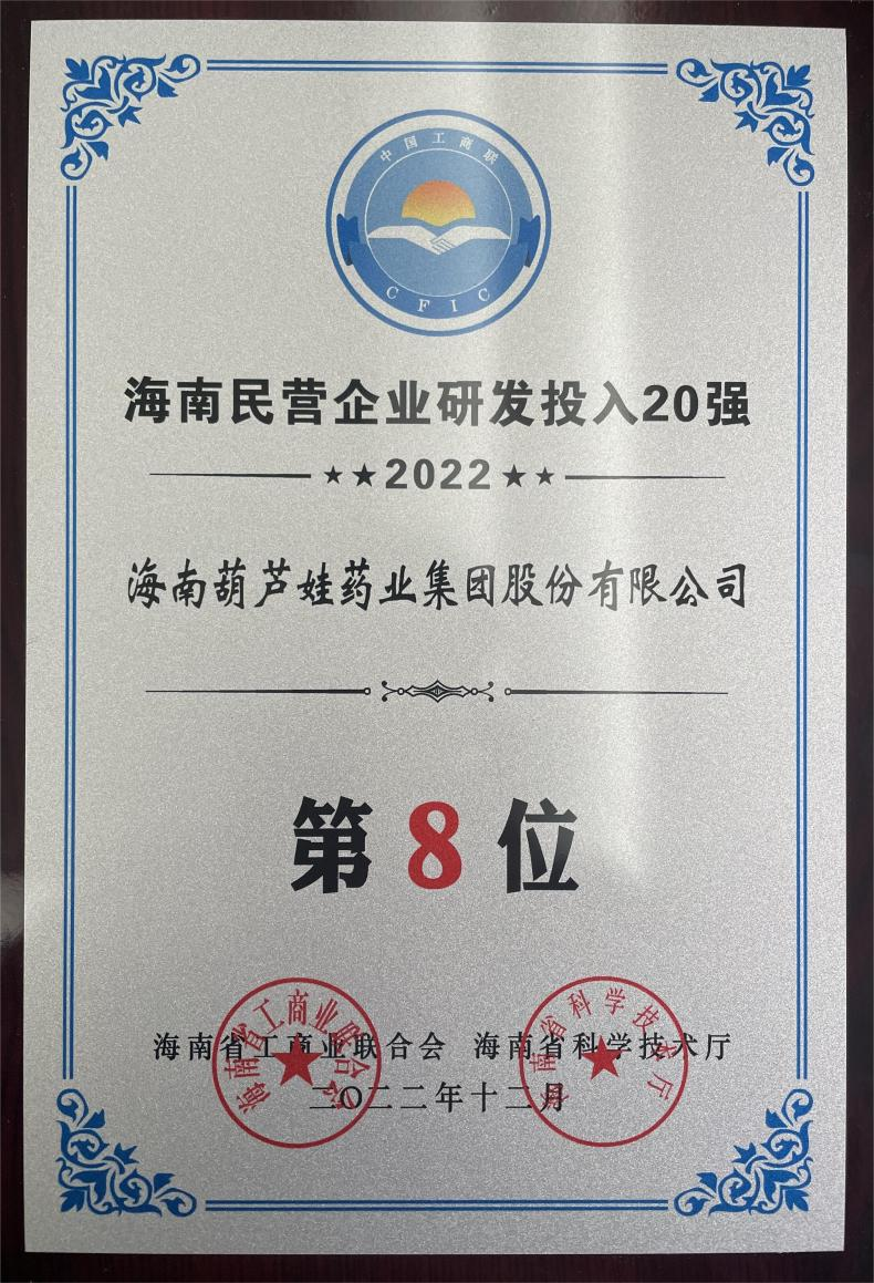 12月23日,2022海南民营企业50强和研发投入20强发布会在海口举行。会上发布了“2022海南民营企业50强”“2022海南民营企业研发投入20强”榜单和分析报告。拉斯维加斯9888药业再次荣登两榜,在海南民营企业50强榜单中位列第25位,较去年上升8位,这也是公司连续三年登榜;在海南民营企业研发投入20强中位列第8位,较去年上升7位。